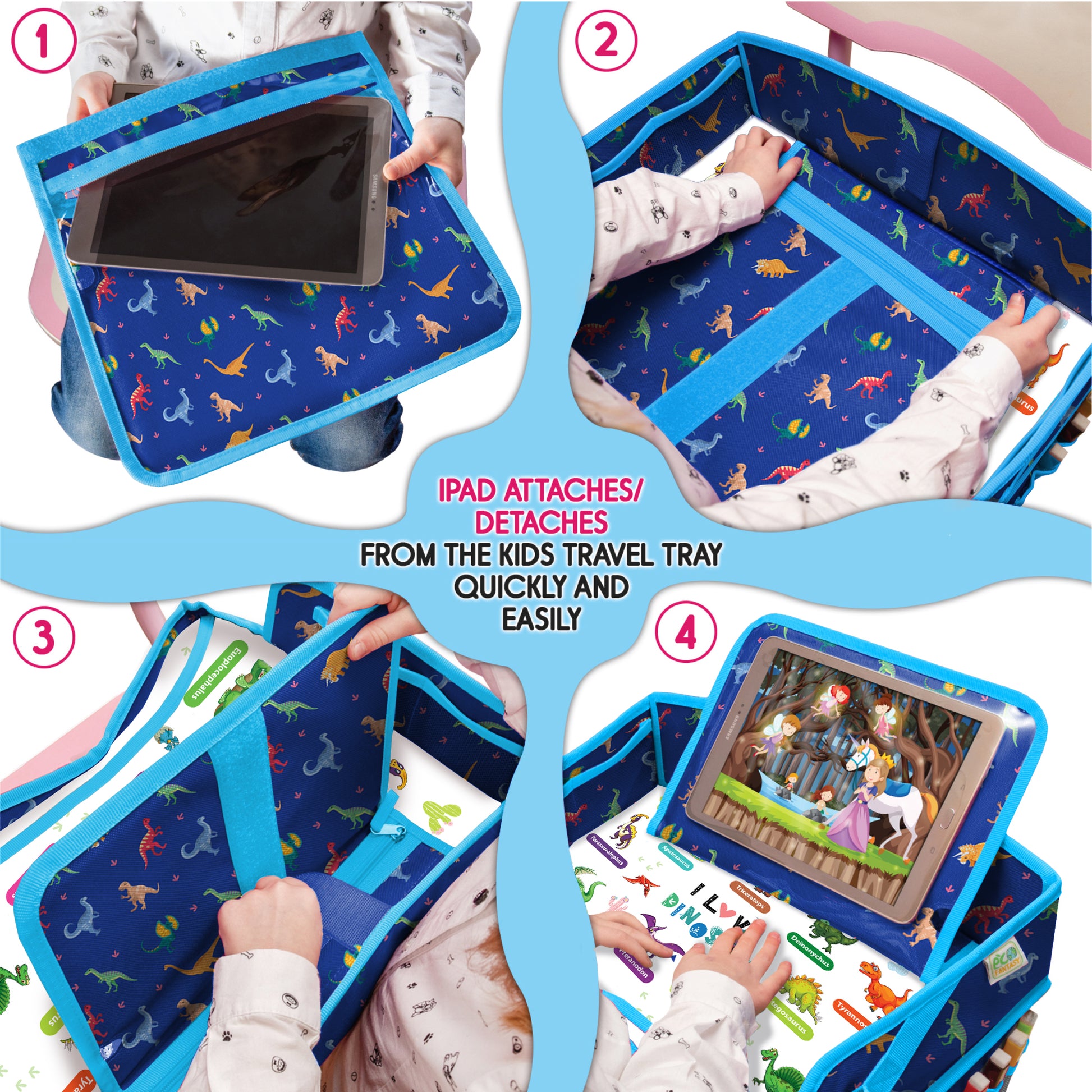 OUR ECOFANTASY COMPACT, FOLDABLE KIDS LAP TRAY is perfect for long car trips, keeps your child occupied when doing errands around town, or riding on an airplane. This sets up in just seconds with secure hard sides that keep papers, markers and toys from sliding off while driving.