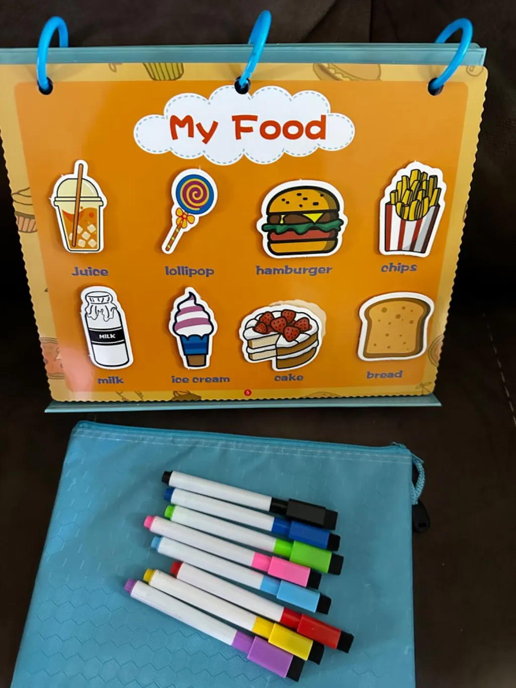 【MY PRESCHOOL BUSY BOOK】This preschool workbook covers 16 themes, including numbers, alphabet, food & drink, fruits, animals, colors, shapes and more. Each themes can enrich the child's knowledge base. There are also 14 drawing and writing pages + dry erase creativity board to meet the needs of children who love to write and paint. It's equipped with gift box, 8 markers and storage bag to carry all parts easily.
