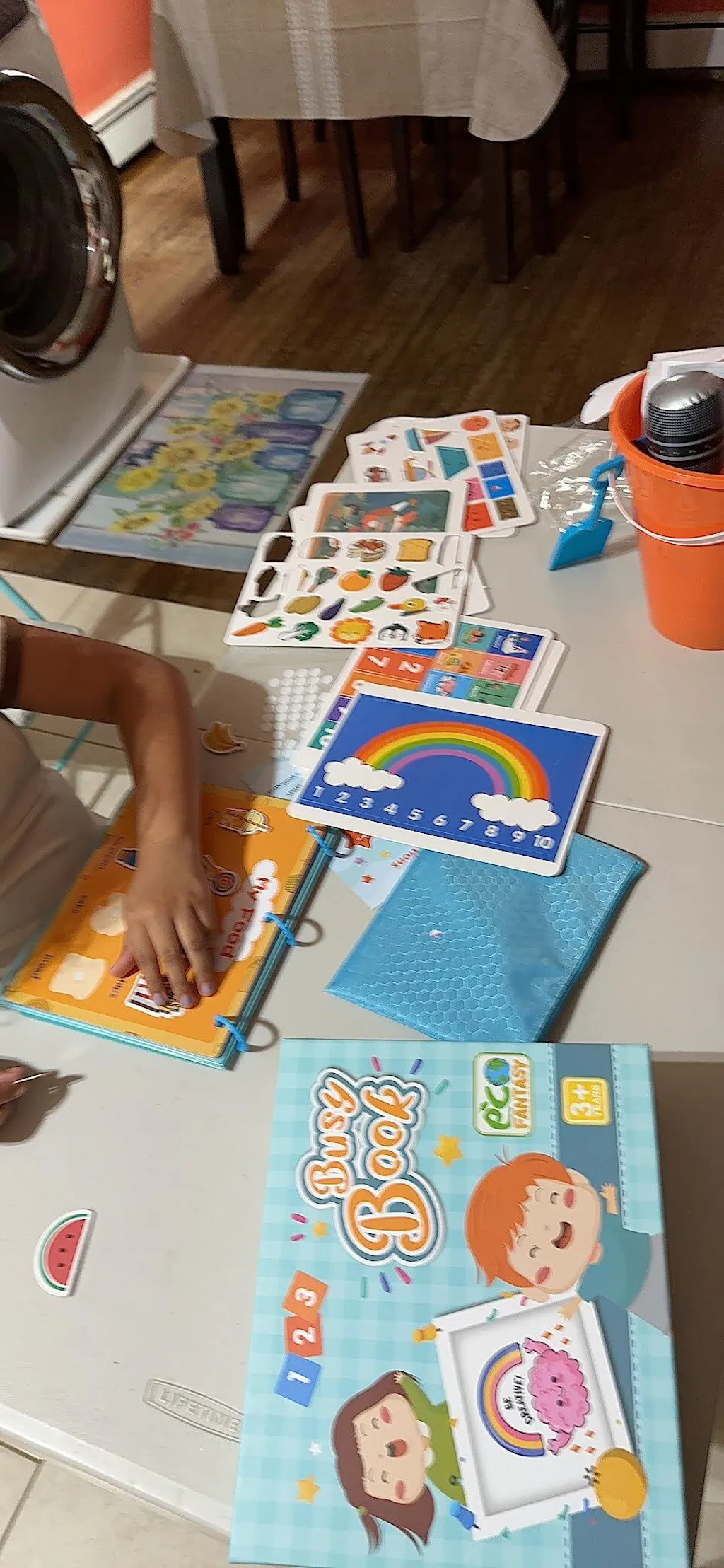 This is a great busy book for my toddler. She loves playing with it and I love that she is learning in the process. Some things are still a little bit to old for her, but still great to have for when she does learn them. It was easy to put together but a little time consuming, but I let my little one help put the velcro stickers on and she had fun doing that and it was a bonus cause she had to use her fine motor skills. I think the only negative thing I would say about it, is the rings that hold it together don't stay locked very well. Other than that over all a great book!